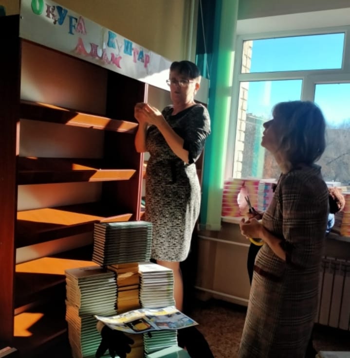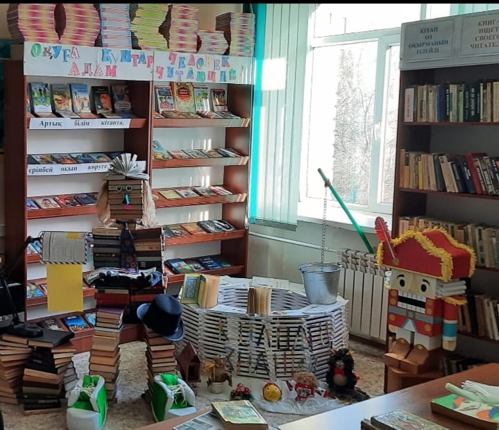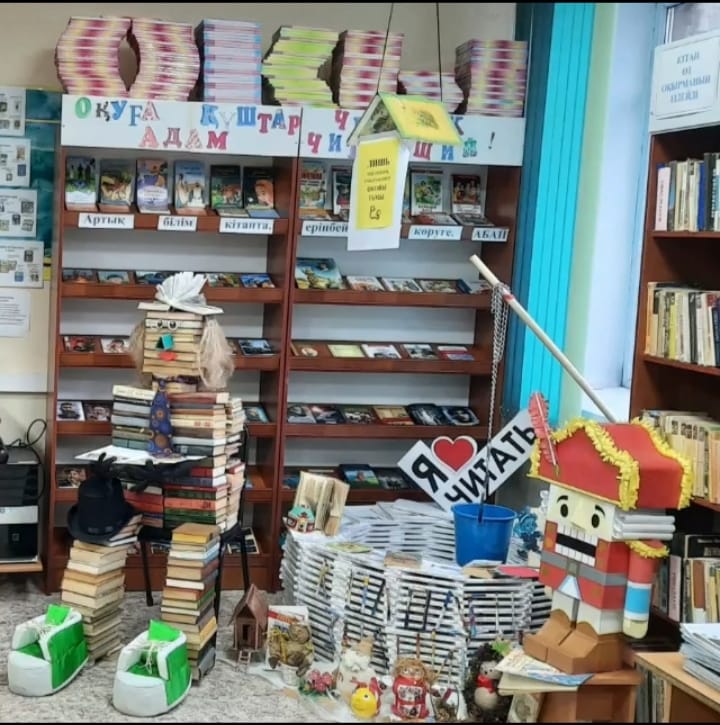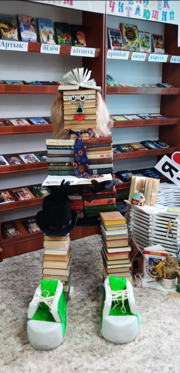 Книжная инсталляция нашей группы называется - «Человек читающий». Фоном для инсталляции является книжная выставка «Оқуға қүштар адам. Человек читающий», где представлены книги для чтения.
