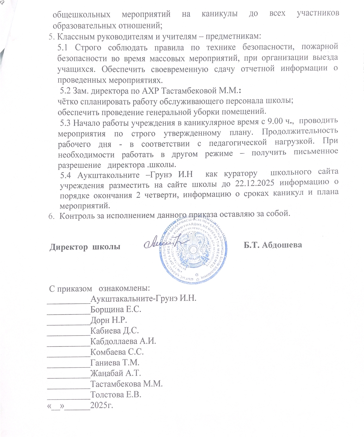 Қазіргі уақытта мектепті Б. Т. Абдошева басқарады.